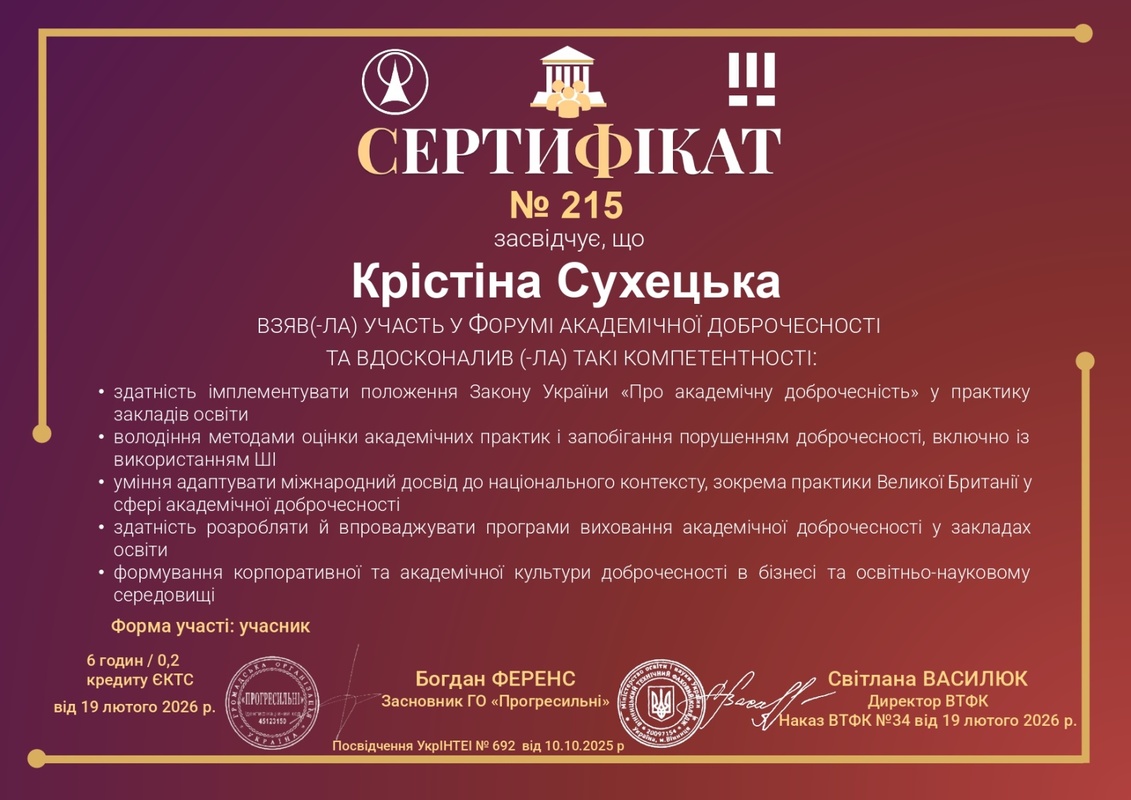 19 лютого 2026 року відбувся Форум академічної доброчесності «Нові правила – нові можливості для освіти». Учасницею форуму стала викладач-стажист кафедри менеджменту Крістіна Сухецька.