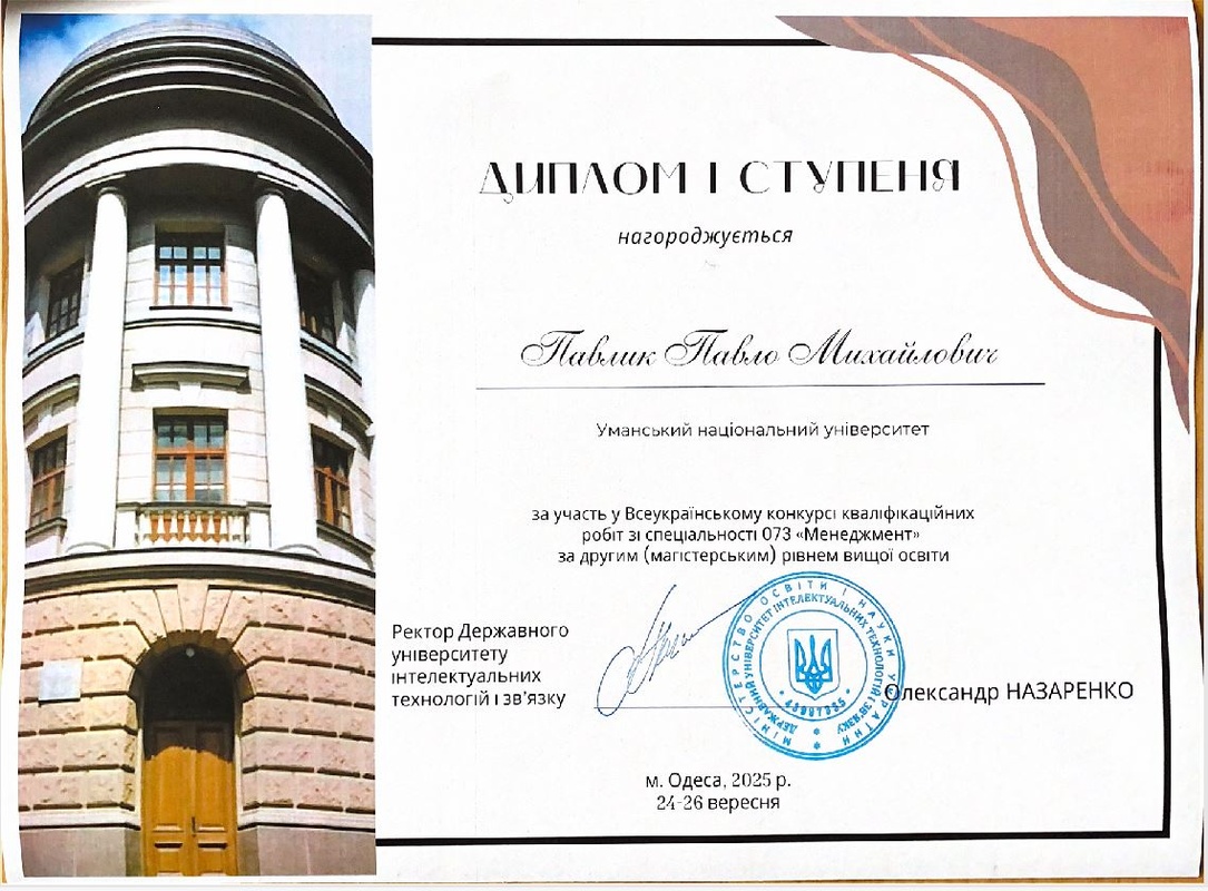 Уманський національний університет посідає гідне місце серед провідних закладів вищої освіти України, засвідчуючи значні здобутки у професійній підготовці фахівців та науково-дослідній діяльності, послідовно зміцнюючи свої позиції у національному освітньому просторі. Одним із таких здобутків є відзнака магістранта факультету менеджменту Павла ПАВЛИКА, який здобув перше місце у Всеукраїнському конкурсі кваліфікаційних робіт зі спеціальності 073 «Менеджмент», що відбувся наприкінці вересня 2025 року на базі кафедри менеджменту та маркетингу Державного університету інтелектуальних технологій і зв’язку (м. Одеса). Його кваліфікаційна робота на тему «Удосконалення логістичного менеджменту в ПрАТ «Київський вітамінний завод» м. Київ» (науковий керівник – д.е.н., професор Олександр ШКОЛЬНИЙ) була високо оцінена журі конкурсу та відзначена дипломом І ступеня. Дослідження студента відзначалося оригінальністю, глибиною аналітичного підходу, творчістю та практичною спрямованістю.