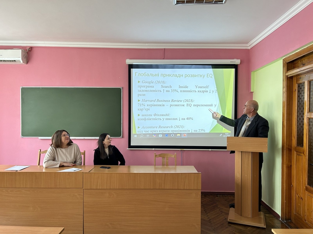 З метою розвитку сучасних управлінських компетентностей та підвищення ефективності професійної взаємодії науково-педагогічними працівниками кафедри менеджменту Лілією КУСТРІЧ, Олександром ШКОЛЬНИМ, Крістіною СУХЕЦЬКОЮ було проведено науково-практичний воркшоп «Діагностика емоційного інтелекту колективу як основа підвищення управлінської ефективності», орієнтований на науково-педагогічних працівників, здобувачів освіти, керівників та фахівців підприємств різних сфер діяльності.