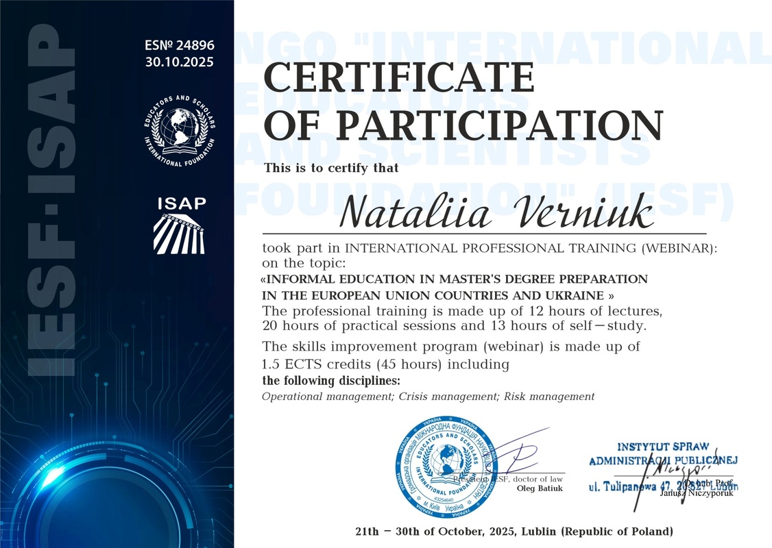 Підвищення кваліфікації було організоване Громадською організацією «Міжнародна фундація наукової освіти» та об’єднало учасників із різних країн, зацікавлених у впровадженні сучасних європейських освітніх підходів у систему вищої освіти. У межах програми Наталія ВЕРНЮК поглибила знання щодо актуальних тенденцій розвитку неформальної освіти в країнах ЄС, ознайомилася з інноваційними методиками підготовки здобувачів вищої освіти та здійснила аналіз можливостей адаптації європейських практик до національного освітнього простору. За результатами участі Наталія ВЕРНЮК отримала сертифікат міжнародного зразка, що засвідчує успішне завершення програми.