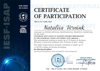 З 21 по 30 жовтня 2025 року завідувач кафедри менеджменту Уманського національного університету, кандидат економічних наук, доцент, Наталія ВЕРНЮК взяла участь у Міжнародному дистанційному науково-педагогічному підвищенні кваліфікації на тему: «Неформальна освіта у підготовці здобувачів вищої освіти в країнах Європейського Союзу».