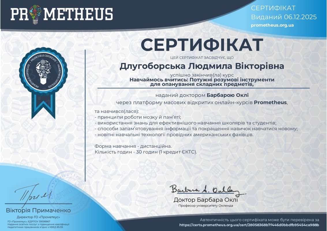 Викладач кафедри менеджменту Уманського національного університету Людмила Длугоборська успішно завершила онлайн-курс «Навчаємось вчитись. Потужні розумові інструменти для опанування складних предметів», реалізований на освітній платформі Prometheus, та отримала сертифікат.