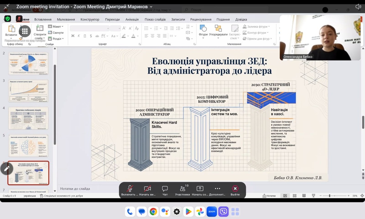 У секції з менеджменту зовнішньоекономічної діяльності студентка Олександра БЕБКО виступила із дослідженням: «Менеджер зовнішньоекономічної діяльності майбутнього: модель професійних компетенцій в умовах цифровізації та глобальної нестабільності» (науковий керівник – к.е.н., доцент Лідія КЛИМЕНКО).