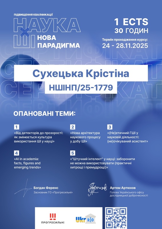 Викладач-стажист кафедри менеджменту Крістіна Сухецька успішно пройшла онлайн-курс підвищення кваліфікації «Наука ´ ШІ: нова парадигма», який відбувся з 24 по 28 листопада 2025 року. Курс організовано ГО «Прогресильні» у співпраці з Українським офісом дослідницької доброчесності.