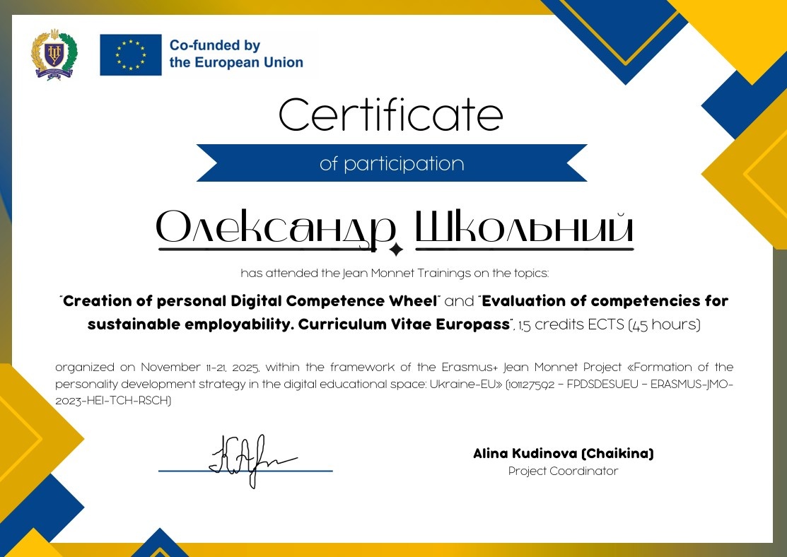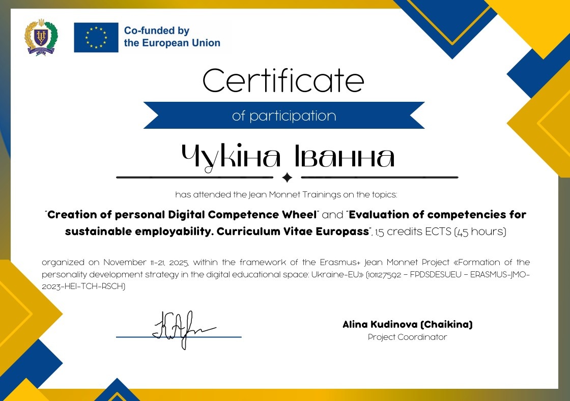 Отримані знання та інструменти стануть основою для подальшої модернізації освітнього процесу на кафедрі менеджменту, а також сприятимуть ефективніше підтримувати здобувачів у формуванні їхніх індивідуальних траєкторій розвитку в умовах європейського цифрового суспільства.