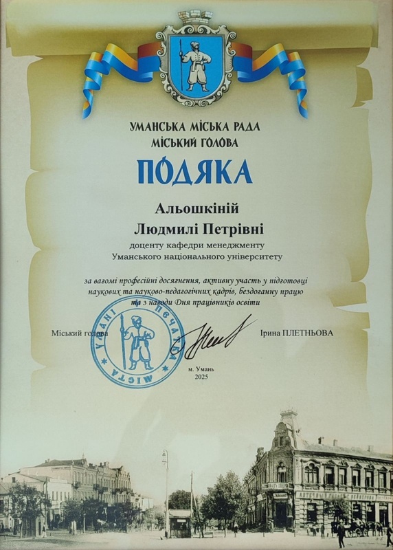 Колектив кафедри менеджменту Уманського національного університету щиро вітає кандидата економічних наук, доцента, Людмилу АЛЬОШКІНУ, з отриманням Подяки Уманської міської ради за вагомі професійні досягнення, активну участь у підготовці науково-педагогічних кадрів, бездоганну працю.