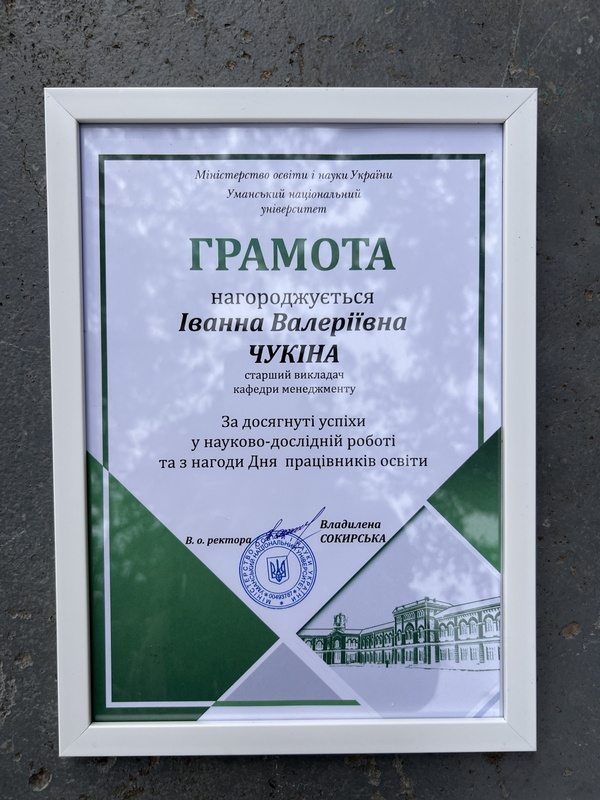 Вітаємо кандидата економічних наук, старшого викладача, Іванну ЧУКІНУ, з отриманням Грамоти Уманського національного університету за досягнуті успіхи в науково-дослідній роботі та з нагоди Дня працівників освіти.